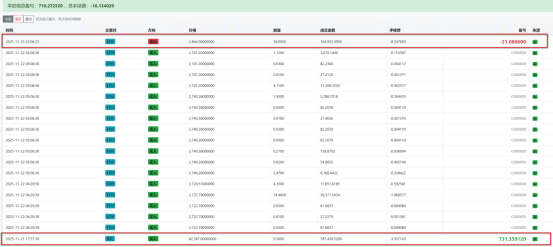 2025.11.24这波这个号ETH是做多的,BTC是空的,先在最低点附近平掉了BTC 空单,又在刚才ETH在最高点附近还亏一点的情况下把ETH给平仓了。如果在BTC平空时同时平掉ETH多单,会亏损几百块。现在反而是赚了700多,单边先平仓可以让方向做错的单子快速出来,反而会赚。